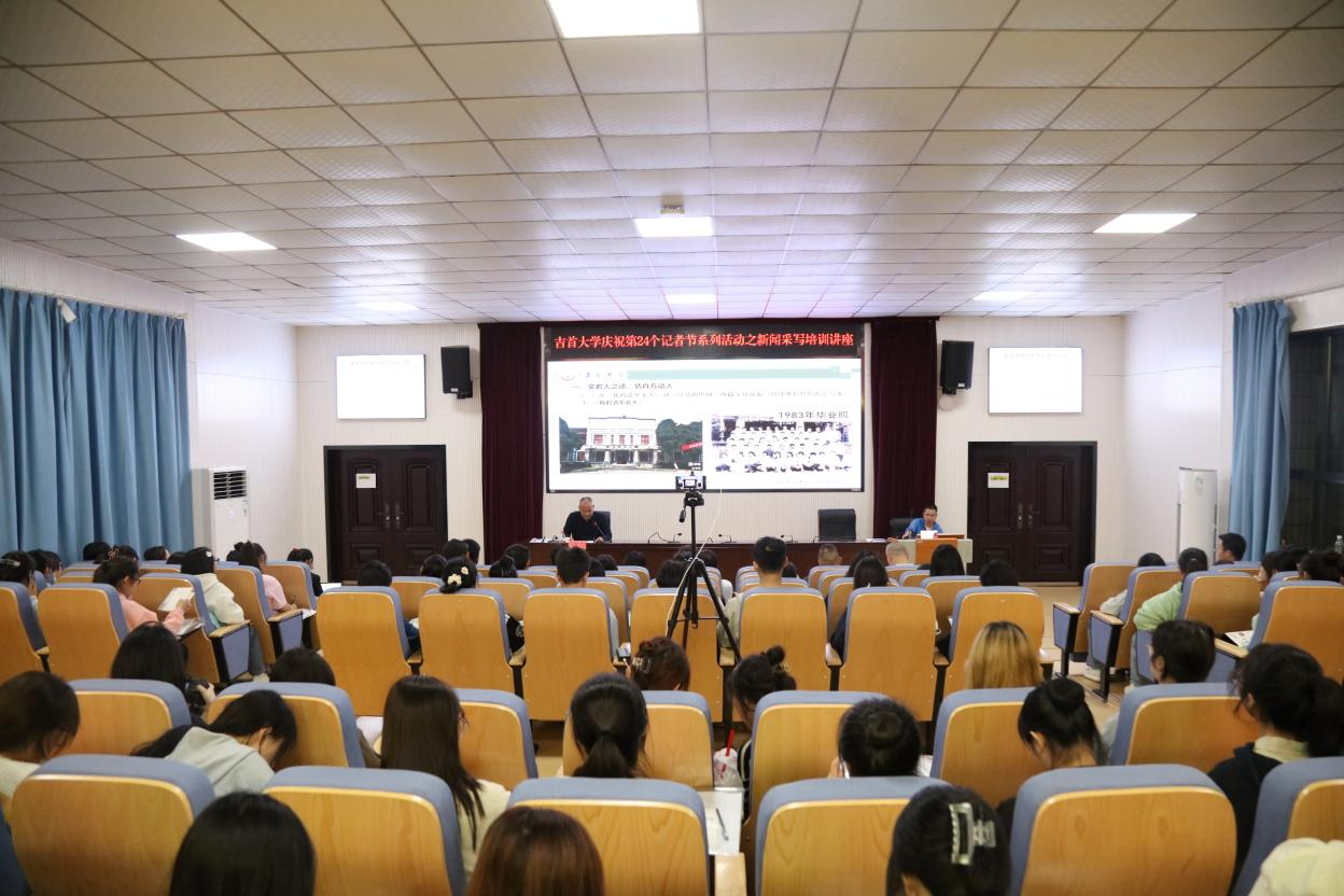 本网讯(通讯员 邓慧玲 苏紫妍 蒋旭玲)11月1日晚,我校在砂子坳校区思政园举办庆祝第24个记者节系列活动之新闻采写培训讲座。特邀湘西州民族中学校长、我校1980级中文系优秀校友彭学军来校,为学校各学院新闻宣传工作者师生代表作题为“写有温度的文字,做有情怀的好青年——与母校爱好写作的师弟师妹们共勉”的主题讲座。党委宣传部常务副部长李洪雄研究员主持讲座。