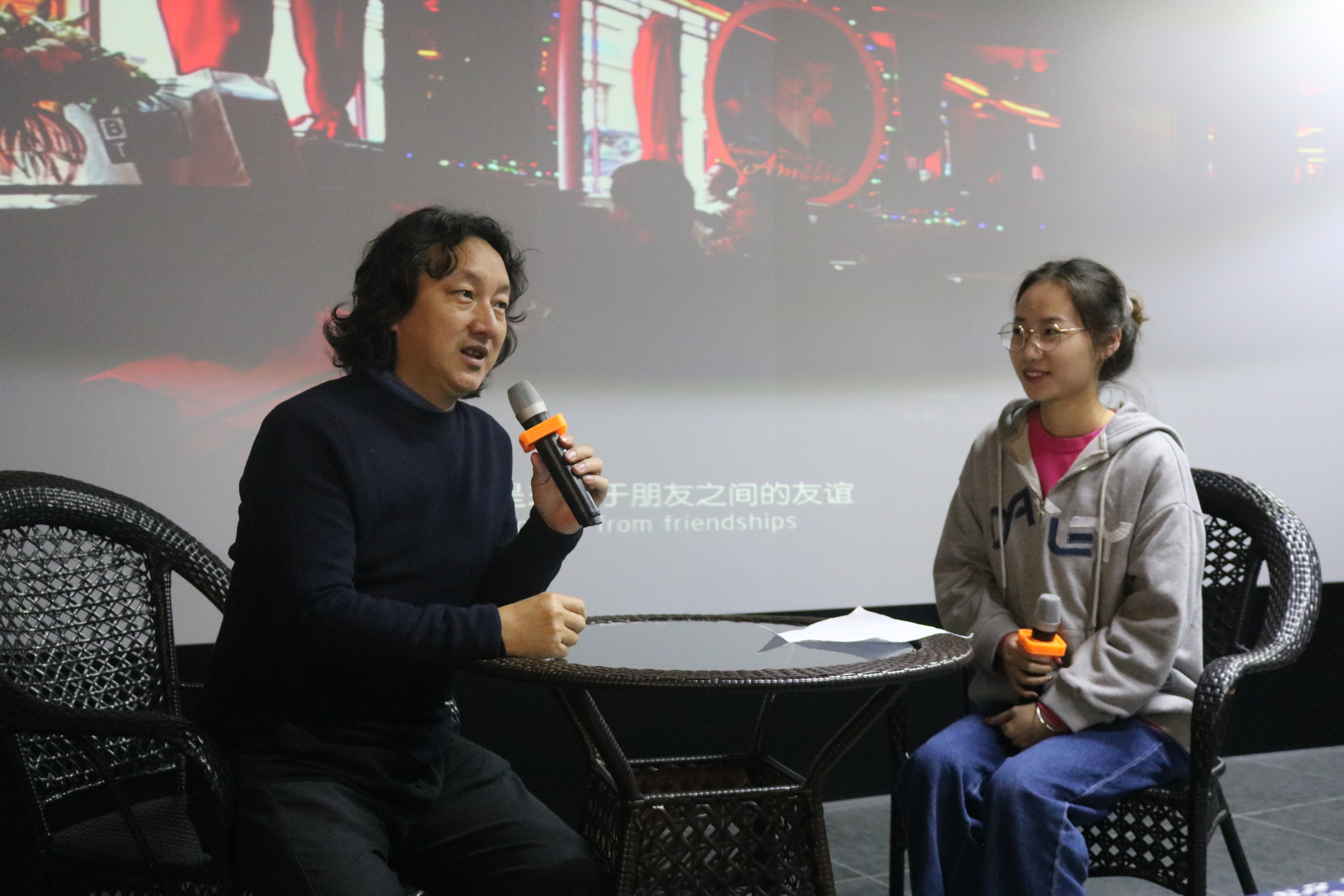 图为我校校友、著名纪录片导演刘海平接受现场访谈