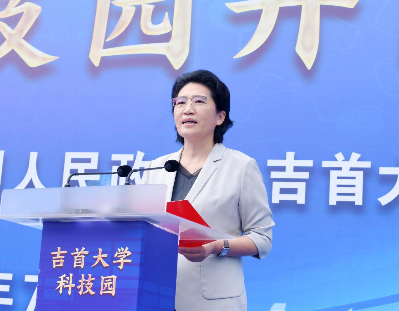 陈华在致辞中表示,吉首大学科技园开园,是湘西州科技创新发展史上的一件大事喜事,标志着地校双方在深化产学研合作、服务经济社会发展、推动科技创新与成果转化等方面迈出了新的坚实步伐。她希望吉首大学围绕科技园总体发展思路,切实把科技园建设好。湘西州委、州政府将一如既往大力支持科技创新工作,竭尽全力为履行好协议提供最强保障、为吉首大学科技园建设提供最大支持、为科技创新提供最好资源、为创业兴业提供最优服务,让科技创新更好助推现代化湘西建设和高质量发展。