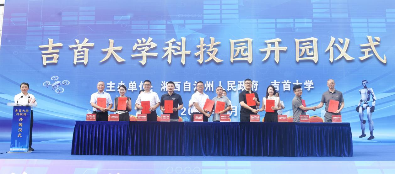 仪式现场,湘西州人民政府副州长高湘文和吉首大学副校长姜又春签署地校合作协议。吉首大学中药大健康产品研发和综合服务团队等5个科研团队代表,与湖南果乐农业科技股份有限公司等5家重点合作企业签署合作研发协议。首批入驻科技园的 30 支团队中,有19个教师科技创新团队和11个学生创新创业团队,涉及新能源、人工智能、生物医药等领域,展现了吉首大学在推动科技创新、服务地方产业等方面的强大潜力。