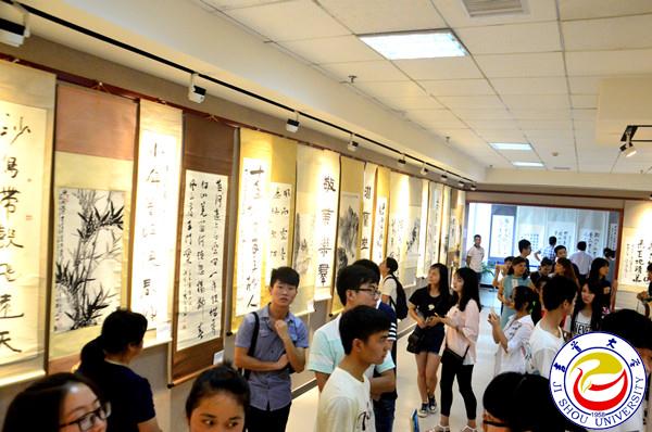 仪式结束后,与会领导师生一同参观了在临时展厅内举行的书画展。此次书画展精选展出了社会各界人士庆贺学校历年校庆的80余幅艺术精品,完整地展现了学校50多年来的发展历程,具有极高的艺术价值。
