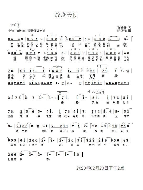本网讯(图书馆 余弦)2020年春节期间,新冠肺炎疫情在武汉出现,迅速蔓延,湖北告急,一方有难,八方支援。2月15日,吉首大学第一附属医院、附属中医院20名医护人员,作为湘西第一批援鄂专家,离开家乡、告别亲人,走上征程,驰援湖北。吉首大学图书馆老馆长谷遇春研究馆员为白衣天使的事迹所感动,有感而发,饱含深情连夜创作歌词《战疫天使》,表达对“逆行者”的敬意。为白衣天使加油,为武汉加油、为中国加油。