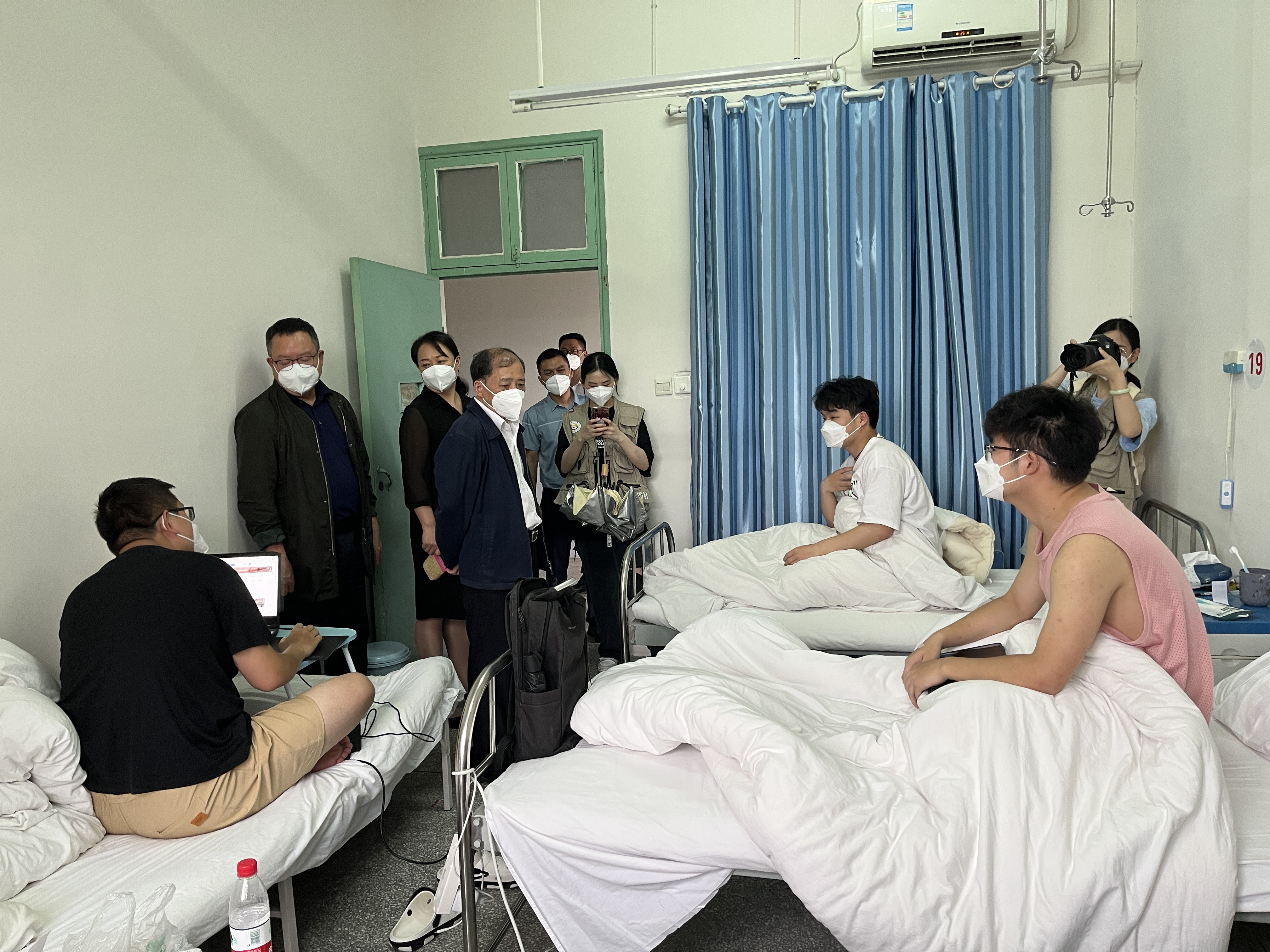 廖志坤一行来到学校健康驿站隔离病房亲切慰问学生,详细询问了同学们隔离期间的生活学习情况以及存在的困难和问题,鼓励他们在这个特殊时期调节好生活状态与学习节奏,有任何生活和学习上的问题要及时向学院和老师反映,学校将继续为同学们隔离期间的生活提供全面保障。同时,就学校如何进一步做好被隔离学生的生活学习安排,廖志坤提出四点要求:一是要准备足够的空间,安置隔离人员,并寻找源头,防止更大扩散;二是要积极采取应对措施,规范进行治疗;三是希望已感染的学生保持良好心态,不要紧张;四是要及时接种疫苗,做好防护。