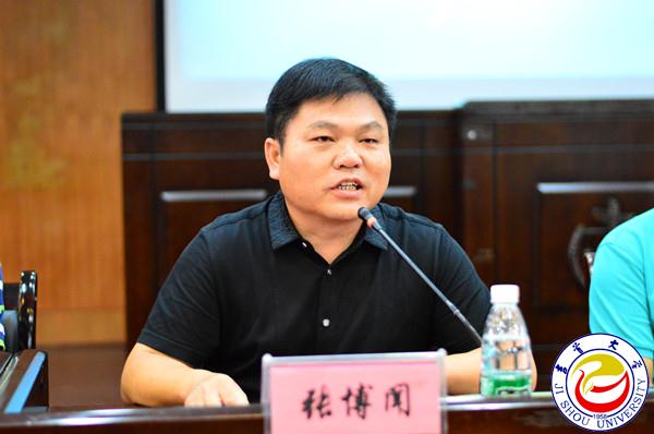 张建永发表讲话。他用张博闻在校时刻苦学习,基层工作时踏实肯干,创业后鏖战商海的故事激励与会学生。他说,作为一名吉大学子,应拥有一份吉大情怀,懂得感恩。他指出,“博闻成才”奖学金不仅仅是一种物质奖励,更是一种精神、一种热爱、一种关怀,他希望大家将这种精神、热爱与关怀,永远地传递下去。