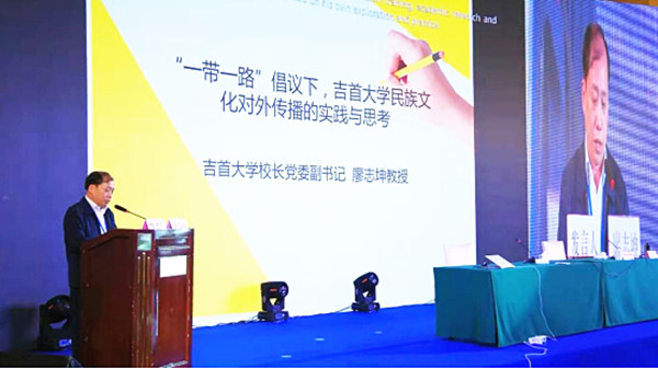 大会主题发言环节,廖志坤以《“一带一路”倡议下,吉首大学民族文化对外传播的实践与思考》为题,介绍了吉首大学积极响应“一带一路”倡议,在民族文化国际化传播人才培养、少数民族文化研究、民族文化传承及保护等方面的实践及成效。针对民族文化对外传播,提出了四点思考:在对外传播理念上,应坚持开放包容,平等互鉴;在对外传播内容上,应聚焦展示共性,彰显特色;在对外传播方法上,应遵循认知优先,移情入行;在对外传播效果上,应注重传播致效,服务国家。