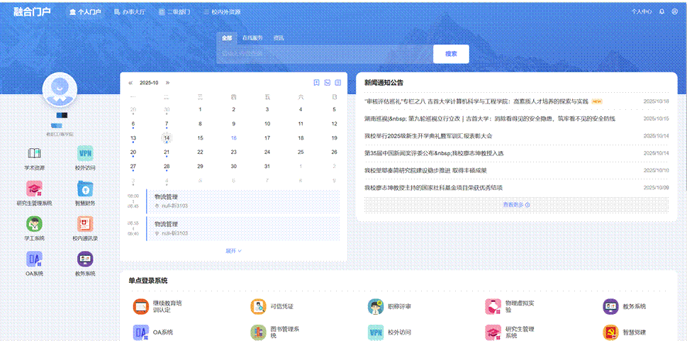 新版平台的核心能力提升具体体现在:1.智能化门户首页。全新设计的门户首页实现了信息的精准聚合与主动服务。个人日程模块深度联动教学管理系统与校级会议安排,并支持创建个人与群组日程,结合微信自动提醒,实现个人事务的智能化管理。2.个性化信息订阅。建立了全校部门网站工作动态的自动抓取与聚合机制,师生可根据自身关注领域,按需订阅信息流,实现“千人千面”的资讯获取体验。3.统一消息中心。构建了全校级的消息推送枢纽,确保各类通知、待办、预警信息能够统一、及时、准确地触达用户。4.精细化任务管理。待办任务模块功能进一步增强,支持任务分类、优先级划分与主动提醒,有效提升个人与协作效率。5.一站式办事大厅。全新上线的网上办事大厅,首批集成了各业务部门面向师生的核心服务事项,提供清晰的办事指南与在线办理入口,是推动“一网通办”落地的实体平台。6.全终端无缝体验。融合门户所有功能均实现移动端适配,确保师生在PC端与移动设备间享有无缝、一致的业务办理体验。7.高安全统一认证。新版统一身份认证系统引入了多因子认证(MFA)机制,大幅提升账户安全性,同时创新性地支持校友、访客等多类身份接入,为校园生态的扩展奠定了基础。