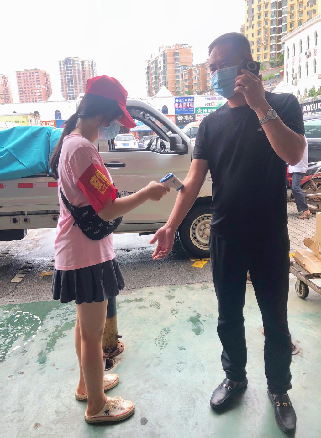 图为施杨捷同学在湖北长江市场建材城为过往人员测量体温