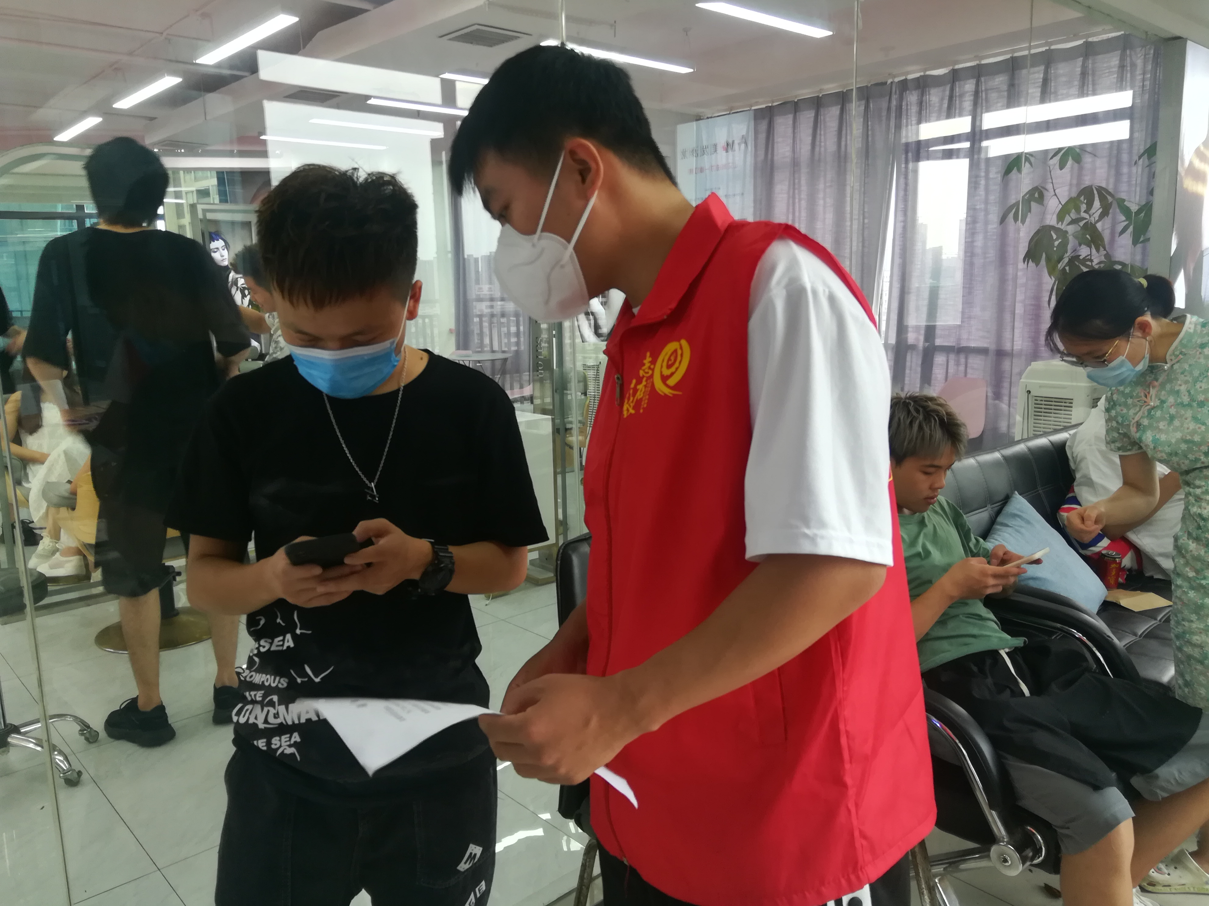 图为刘海波同学在衡阳市石鼓区疫苗接种点给群众讲解疫苗接种流程