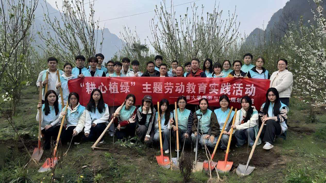 本网讯(通讯员 邓甜)3月12日,在第48个植树节到来之际,旅游与城乡规划学院组织学生干部、党员前往永定区杆子坪大桥高老庄,开展“耕心植绿”义务植树劳动教育,帮助村民种植黄柏。